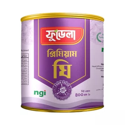Foodela Ghee is a premium quality ghee, typically made from high-quality milk fat using traditional methods. As a product of Bangladesh, it caters to the local preference for ghee with a distinct aroma and flavor that enhances traditional dishes. Ghee is an integral part of Bangladeshi and South Asian cuisine, valued for its rich taste and cooking properties. Foodela Ghee is designed to bring this authentic taste to your kitchen, making it perfect for everyday meals as well as special occasions.Key Features & Benefits:Homestyle Taste and Nutrition: Foodela Ghee aims to provide the authentic, rich flavor and aroma associated with traditionally made ghee, enhancing the taste of your dishes.Made from High-Quality Milk Fat: The quality of the milk fat directly impacts the final ghee, and Foodela emphasizes using good quality milk.Versatile Culinary Use: Ghee is highly versatile and Foodela Ghee can be used in:Biryani and Khichuri: Essential for adding richness and aroma to these staple dishes.Halwa and other Desserts: Creates a rich base for various sweet preparations.Everyday Cooking: Can be used for frying, sautéing, or as a finishing touch to many dishes.Spreading: A nutritious alternative to butter on bread or chapatis.Healthy Fats: Ghee is primarily composed of healthy fats, including saturated fats, monounsaturated fats, and some polyunsaturated fats. It also contains beneficial fatty acids like Conjugated Linoleic Acid (CLA) and butyrate.Rich in Vitamins: Ghee is naturally rich in fat-soluble vitamins, notably Vitamin A, Vitamin E, and sometimes Vitamin K2.High Smoke Point: Ghee has a high smoke point (around 250°C / 482°F), making it suitable for high-temperature cooking without breaking down easily.Lactose and Casein-Free (or trace amounts): Due to the clarification process, most lactose and casein are removed, making it generally suitable for individuals with mild lactose intolerance.Aids Digestion: In Ayurvedic traditions, ghee is believed to aid digestion and promote gut health due to its butyric acid content.Product of Bangladesh: A locally produced brand, ensuring availability and competitive pricing within the Bangladeshi market.Ingredients:High-quality Milk Fat (clarified butter).